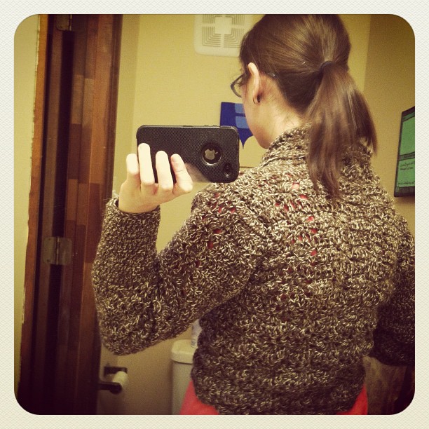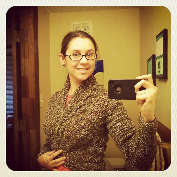 I finished the cardigan! I think it turned out pretty well. Ready for pictures? I must warn you, nobody was home with me so I had to take them in the bathroom using the mirror. Sorry about that.