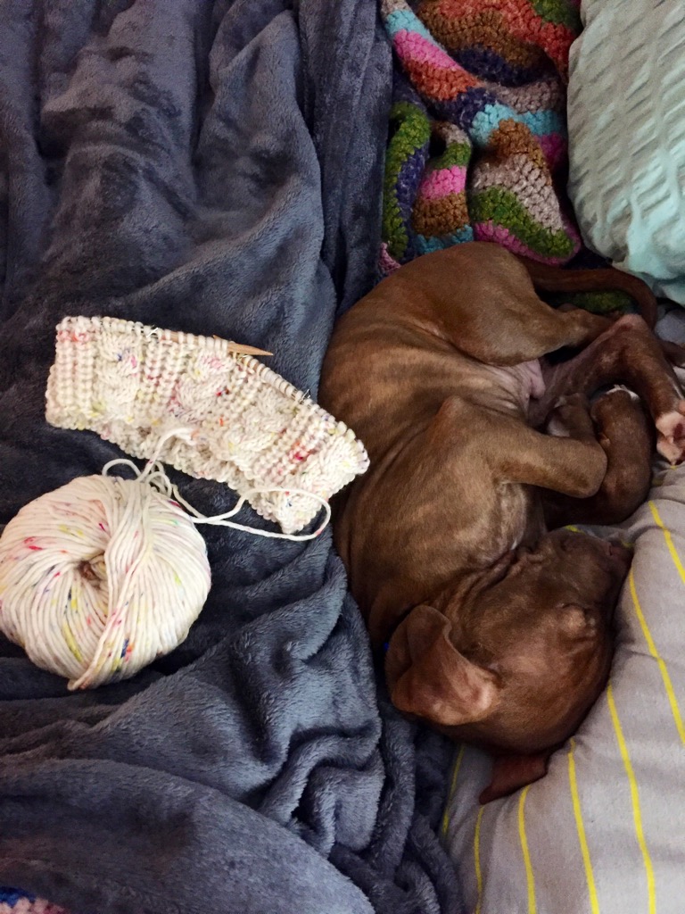 Only thing is, he’s not housebroken yet, so that’s been frustrating. He’s starting to figure it out though & he makes up for it with cuteness and cuddles. He even helps me with knitting (although he’s already mangled one of my wooden cable needles that I foolishly had just sitting on the daybed beside me):