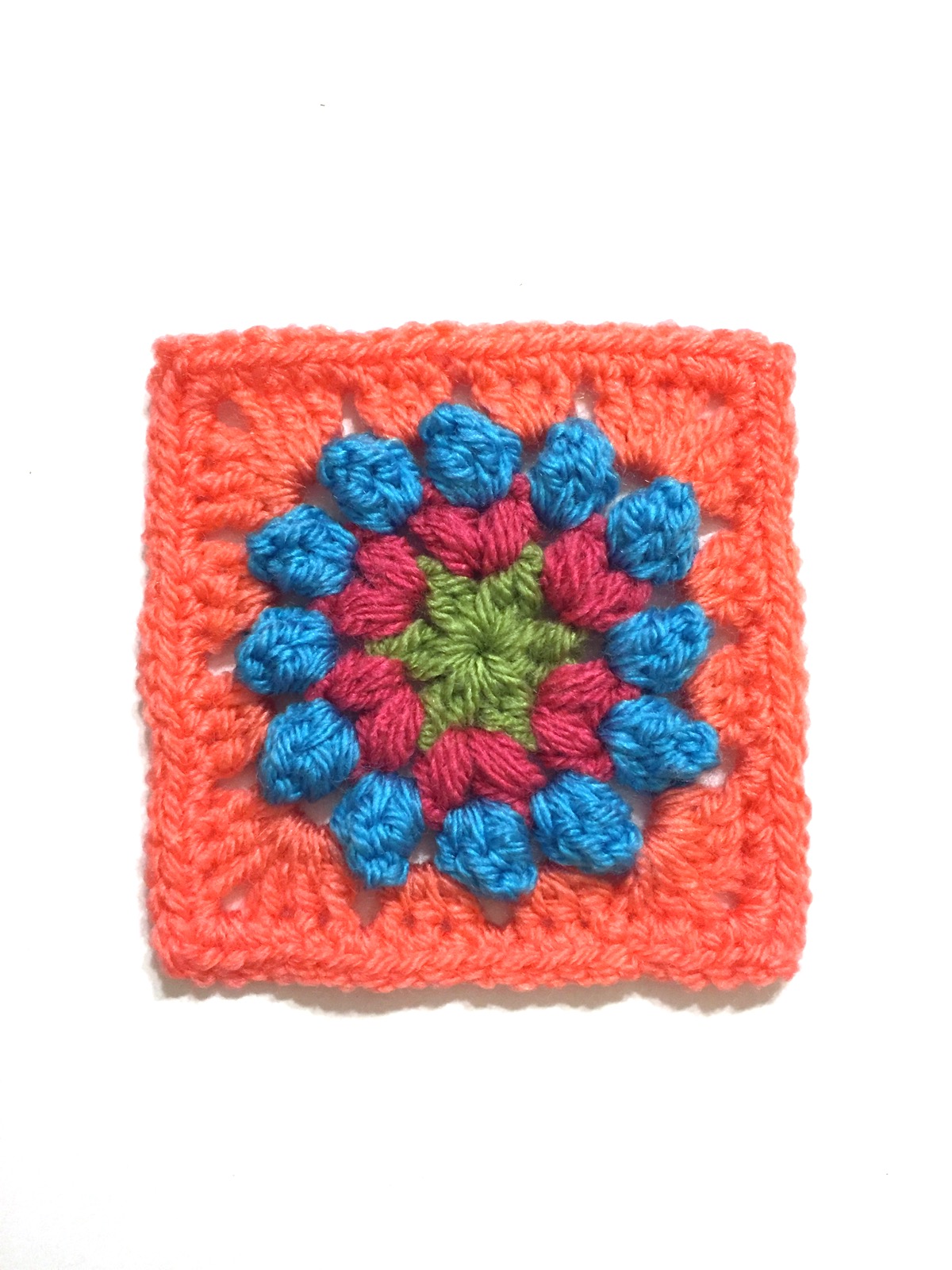 Rnd 3: w/ color C, attach in any sp between the puffs of the previous row and ch 3, dc 3 in same sp. Treating the ch 3 as the 1st of 4 dcs, make a popcorn st, then ch 2. Continue making a popcorn st in the space between each puff of the row below, separating them by 2 chs, until reaching the end. After the last 2 ch, ss in 1st popcorn st, secure & tie off (total of 12 popcorns)
