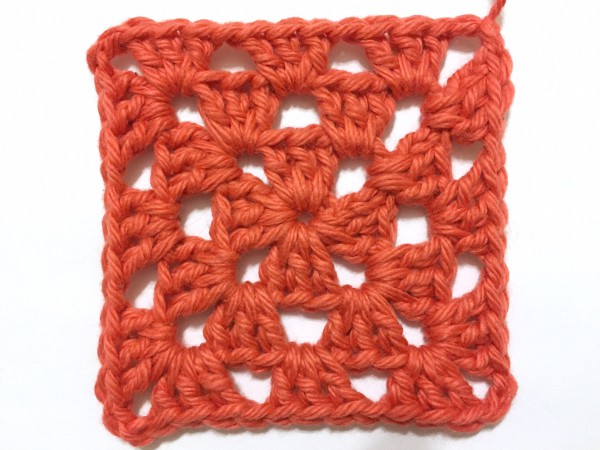 Continue in this manner, making 2 ch between the 3 dc stitches for the corners of the square and 1 ch between them for the sides of the square until your square is as big as you want it to be.  You can change colors between rows if you like.
