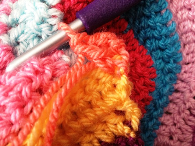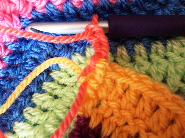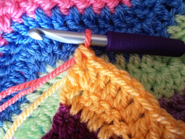 Pull your new color/skein through (that is also how to change colors/skeins in the middle of a row, just so you know, and you would crochet over the ends just like we are going to here in a minute):