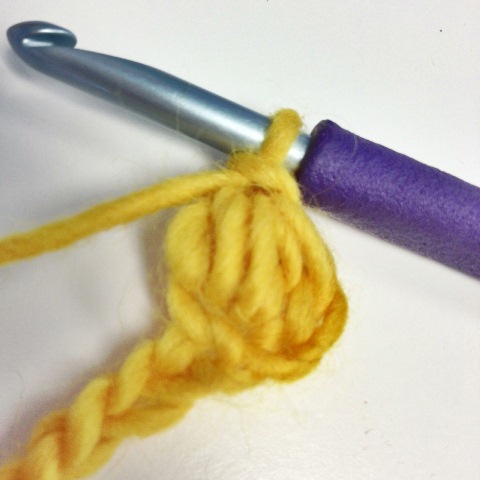 If you want to do what I have done in the above picture, interspersing each puff stitch with a hdc, chain any odd number +2. We will start in the third ch from the hook. Yo, put hook through the third chain, pull a loop through. You’ll have 3 loops on your hook total. Yo, put hook through the same ch, pull another loop through. Do this a third time. You’ll have 7 loops on your hook total: