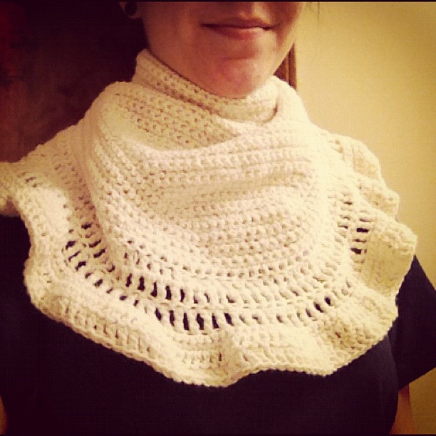 I made this pattern myself out of some yarn I didn’t know what to do with. It’s like a very small shawl that, when put on backwards and wrapped around, looks like this. It’s a lovely neck warmer. The two ends can attach with a button underneath your chin and under the “bib” to keep it in place, if you like.