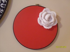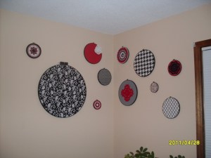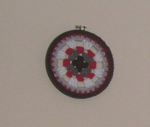 Looking at the picture I might have to go back and adjust the fabric to get it to lay a bit more flat in the frame, but that’s okay. And the stars are actually made up of that plastic shimmery embroidery floss, it’s just hard to tell in the photo.
