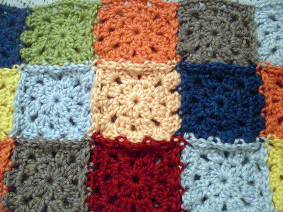 Last night and today, I stitched out another cushion! This one’s about 14″ x 14″ and features Caron Simply Soft, like the last one. I used this crochet button closure tutorial and this border tutorial. I also used this cushion for my inspiration, but the pattern, as far as I know, is all me. The actual pillow was sewn from one of my boyfriend’s undershirts, and stuffed with Poly-Fil. Oh and I used the alternative granny pattern for the squares. Here it is!
