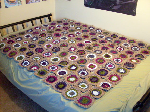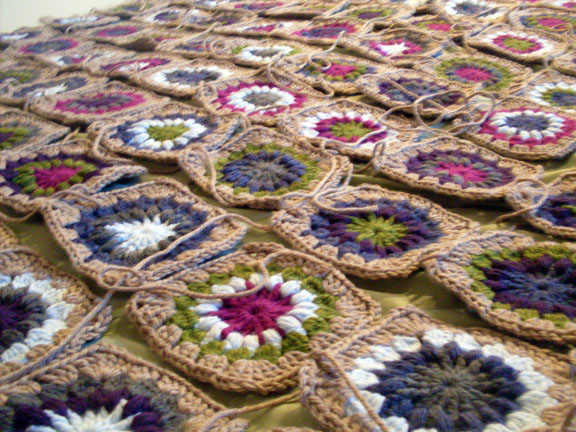 Aren’t they great? I’m so proud! I’ll crochet the ends in when I slip stitch the squares together, and I’m also planning on adding a decent sized border. The blanket was only supposed to cover a double bed, but I think it’ll cover the queen nicely, don’t you?