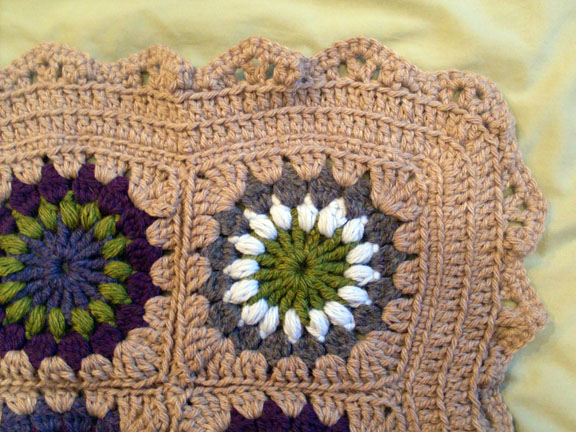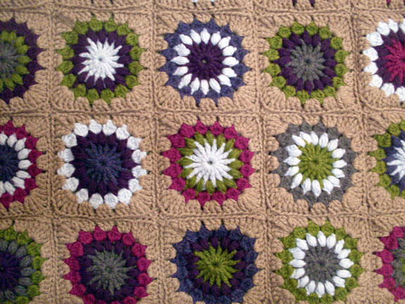 I’m finished joining my afghan squares! Turns out it is a little smaller than I thought it would be, probably due to my usage of a smaller hook to sc the squares together (which was done on the back of the piece). I meant to have nice tight joins but I overdid it a bit and it shrunk the overall size of the thing. I have a feeling it will stretch out with usage — it’s a very heavy blanket! I still have to add the border, so I’m not finished yet, but I wanted to share my progress with you because I’m excited to be done with joining the squares (usually the most tedious part of afghans, in my opinion). So here are the pictures!