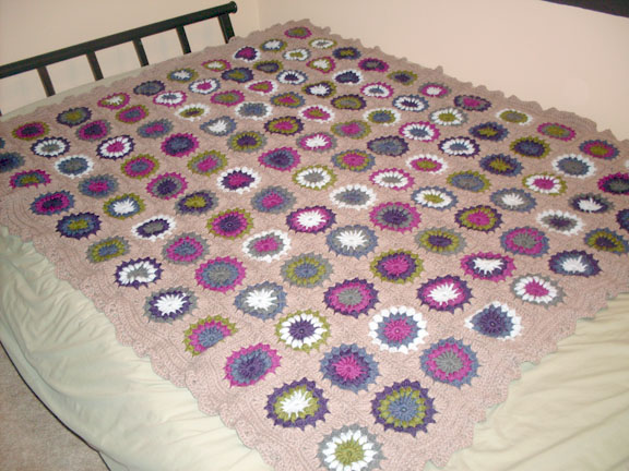 My flower sunburst granny square afghan is complete! Made from Berroco Vintage Chunky, it’s super heavy and thick, so I know it will be toasty (although I’ll never use this yarn for a blanket again — it’s perfect in every way except that it’s too expensive). It covers a double bed, but the picture below is taken on a queen so you can see it all flat with the cute ruffly border I added. This has been my most expensive afghan, but it might just be the one I’m most proud of, too. Here are the finished pictures.