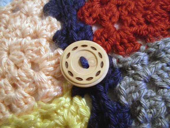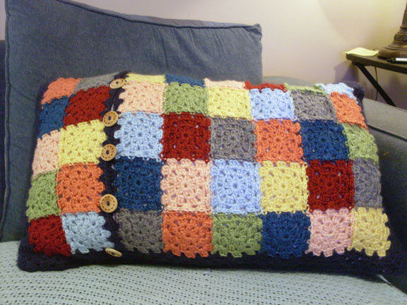 My first cushion ever, made with the square pattern from Attic24 and the border method from Compact UK, has been completed. I’m a little unsatisfied with the shape of the pillow — it’s still lumpy and misshapen looking. Maybe with some use it will work the bumps out itself? The buttons on the back aren’t quite spaced out the way I wanted them to be either, but I honestly just wanted to finish it up. Anyway, here are the pics:
